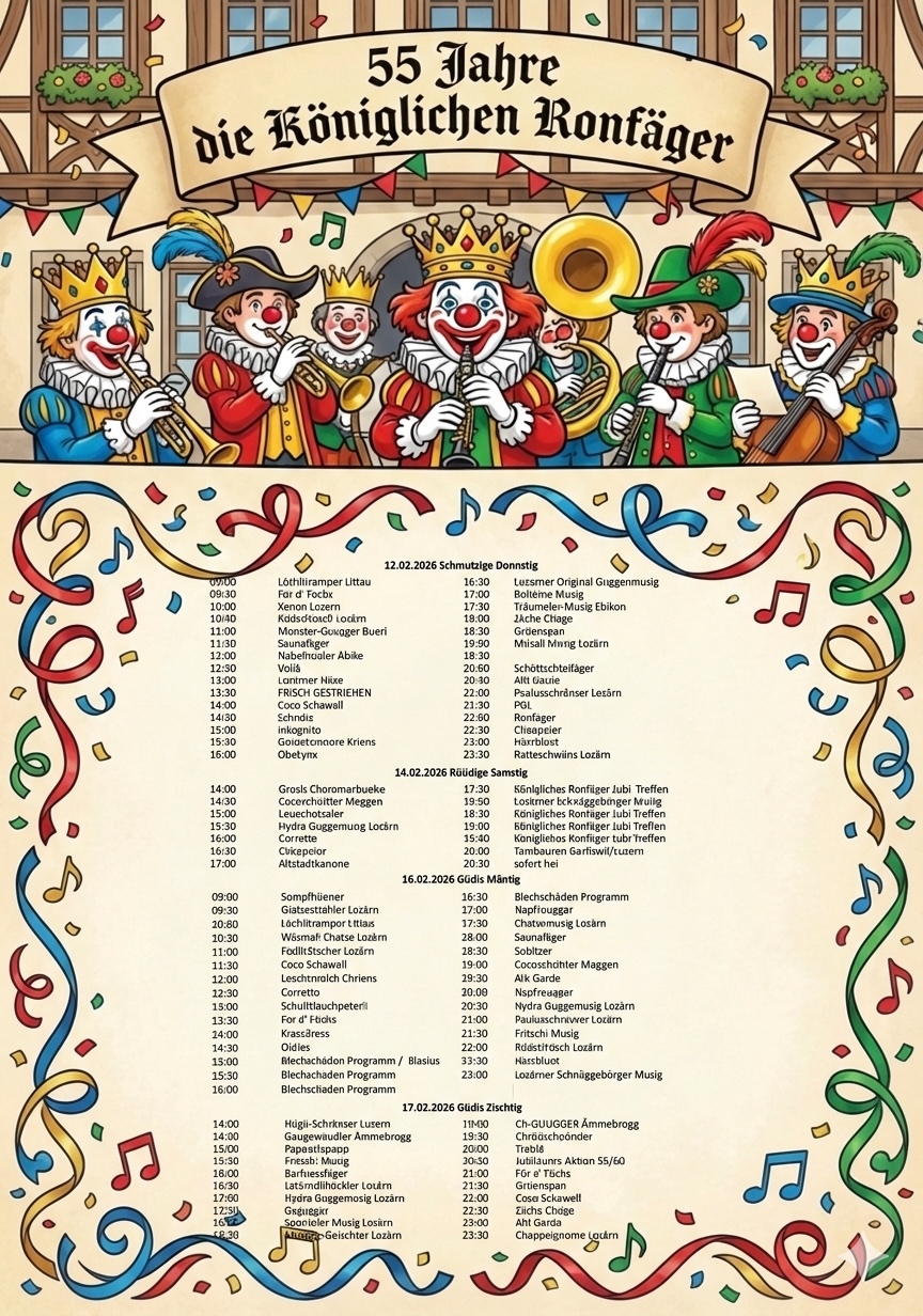 Das Programm in der #Münzgasse 2026 an der #Fasnacht zLuzern. 55 Jahre - die königlichen Ronfäger